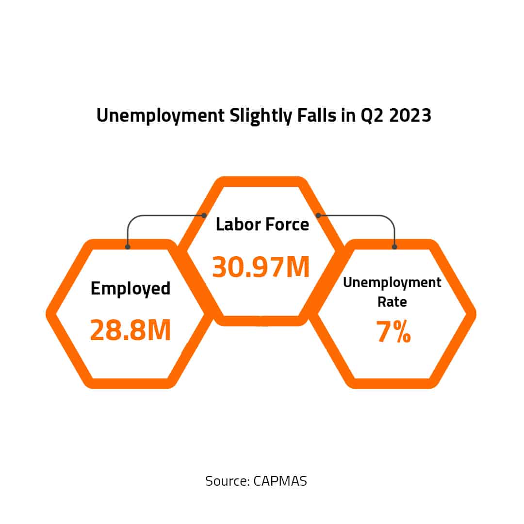 The unemployment rate in Egypt has recorded 7% of total labor force in the second quarter (Q2) of 2023, slipping by 0.1% from Q1 2023.