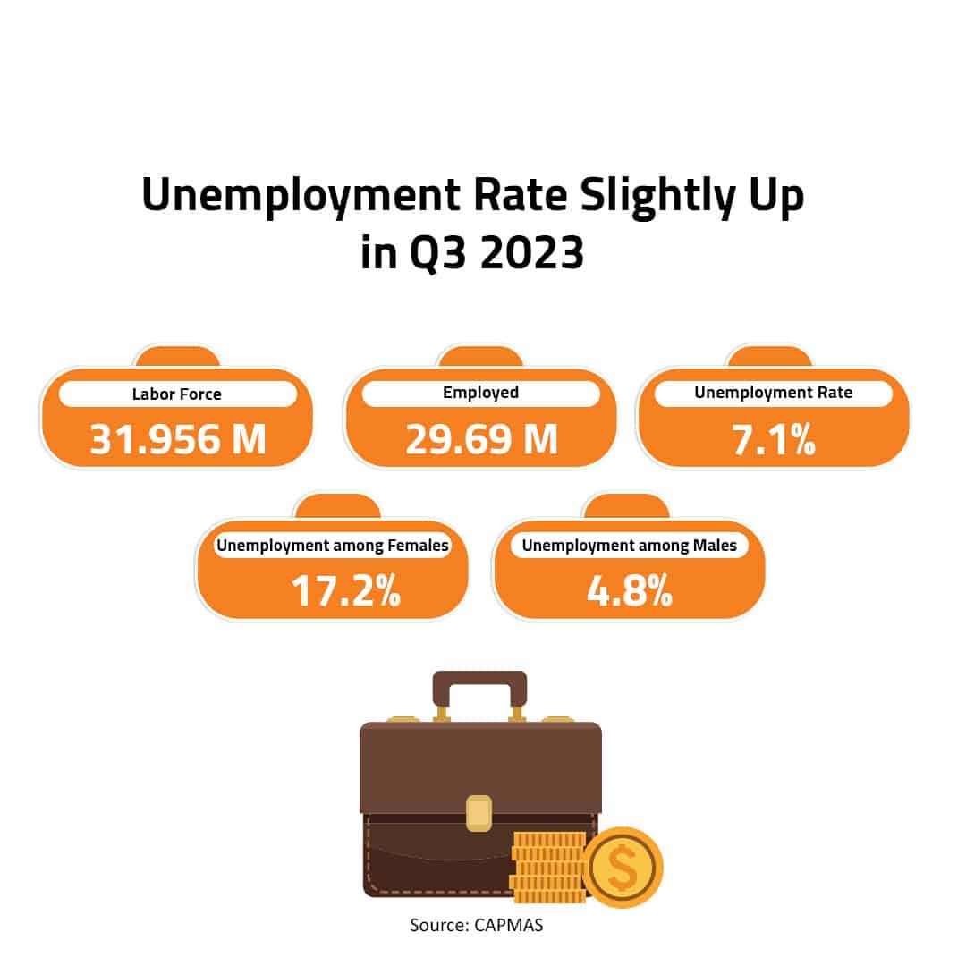 The unemployment rate in Egypt rose to 7.1% during the third quarter (Q3) of 2023, inching up by 0.1% quarter-on-quarter (QoQ).