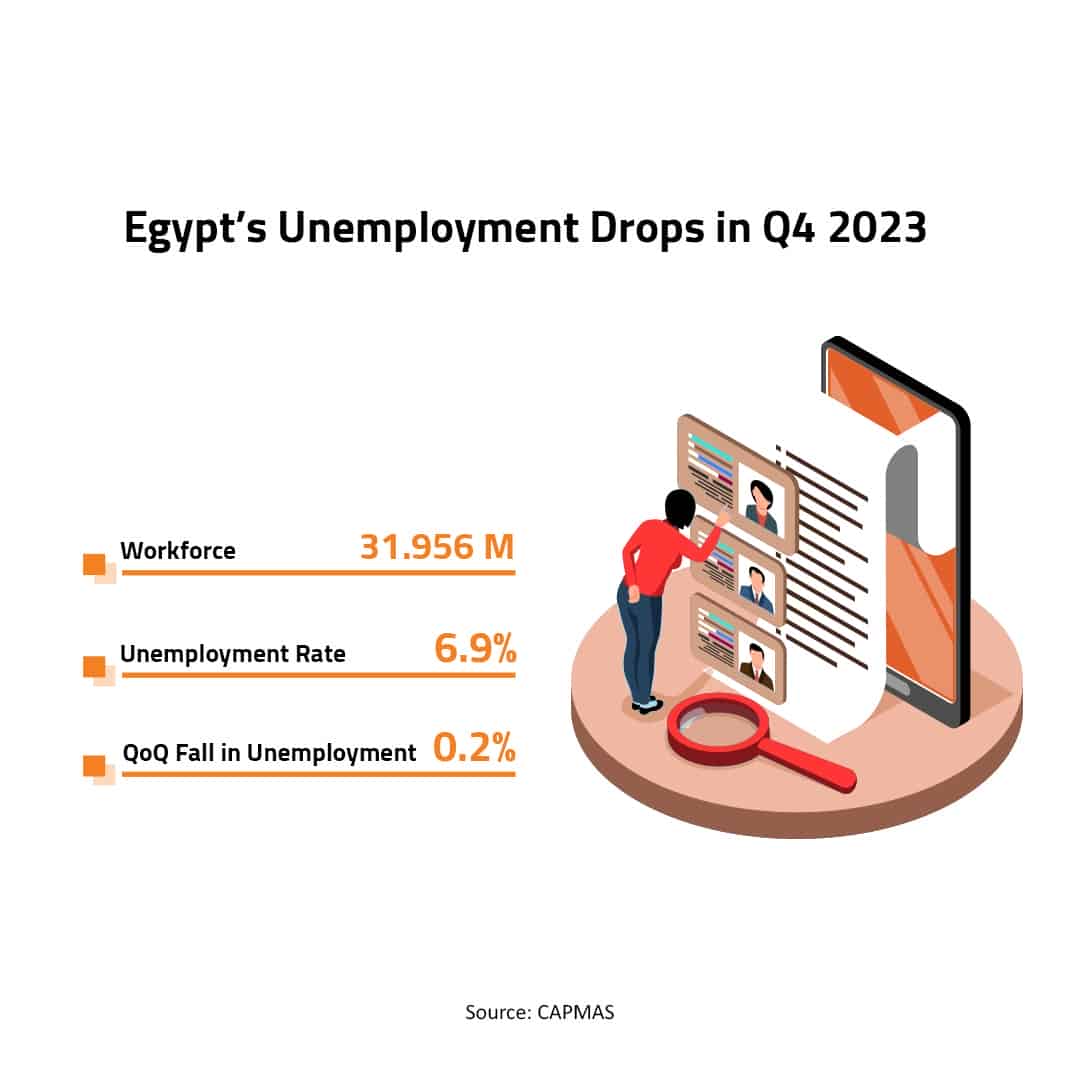 The unemployment rate in Egypt declined to 6.7% in the first quarter (Q1) of 2024 from 6.9% in the last quarter of 2023, according to data from the Egyptian Central Agency for Public Mobilization and Statistics (CAPMAS).