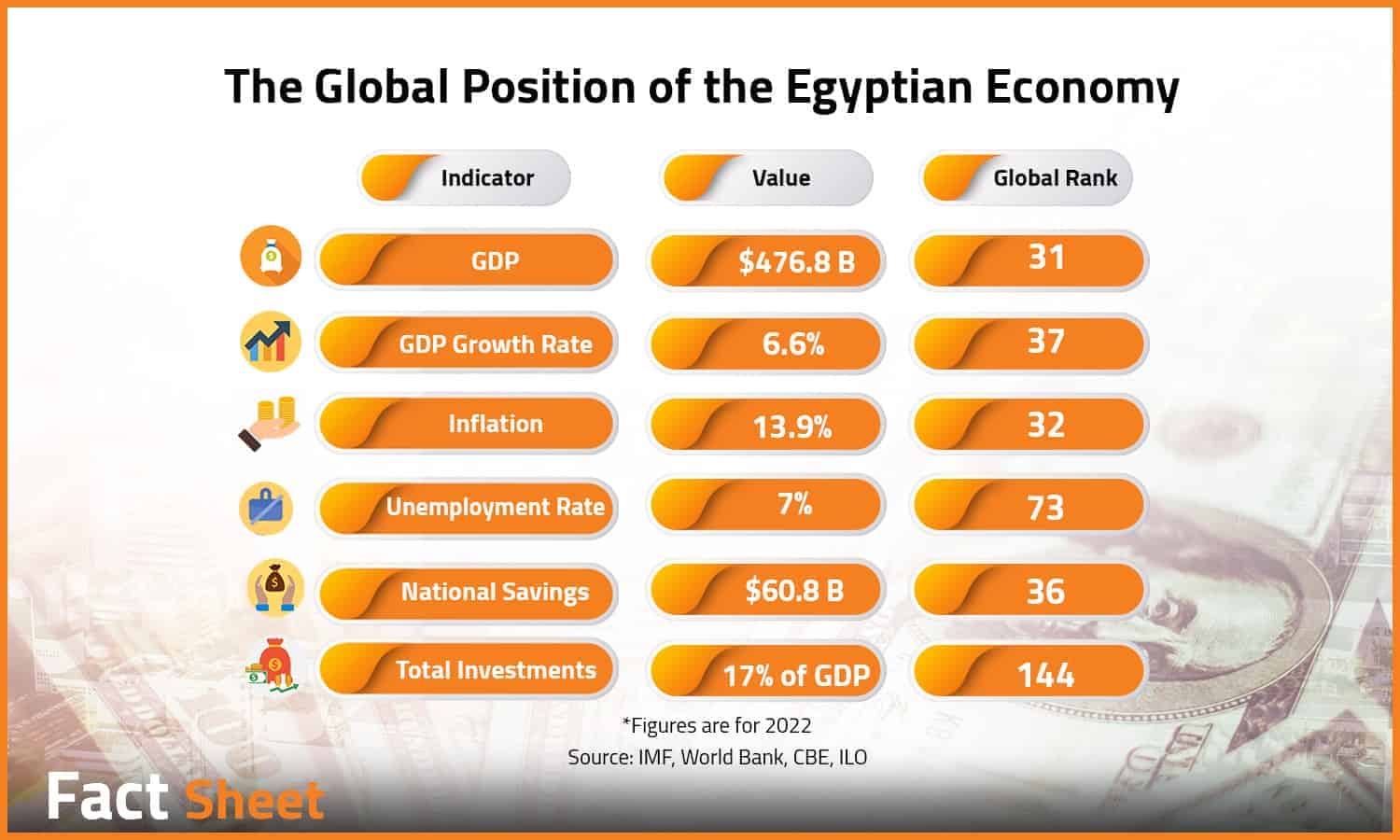 The Egyptian economy has been facing a series of global challenges that have hindered its growth. These challenges started in late 2019 with the spread of the COVID-19 pandemic. While recovering from the repercussions of the pandemic, Egypt’s economy was hit by the Russian-Ukrainian war, which put further pressure on the international prices of essential commodities. In this Factsheet, we will shed light on the recent indicators of Egypt’s macroeconomic performance, such as the gross domestic product (GDP) growth rate, unemployment rate, inflation rate, and other relevant indicators. Then, we will identify where the Egyptian economy stands among other economies, especially those in Africa.